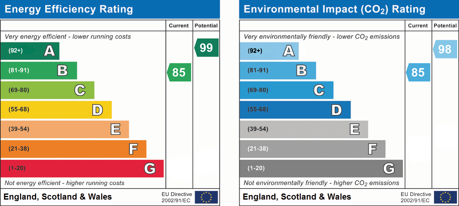 A luxurious four-piece ensuite with spotlight insets and a double glazed window to the rear aspect. Comprising a low-level WC, vanity-mounted wash hand basin with storage beneath, free-standing bath, and shower cubicle with mixer shower. Finished with tiled walls and floor, chrome heated towel rail, and an extractor fan.